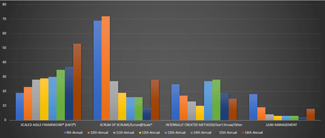 For the past five years SAFe has increased its’ market share significantly now landing at a record 53% and has enjoyed a healthy pattern of growth in CAGR up to 12%. Meanwhile, Scrum@Scale has seen a miraculous bump in market share while combined with Scrum of scrums but is still anchored by overall running negative CAGR. I suspect the questions and categorization are causing some inaccurate reporting. I hope that Digital.ai will separate out the two approaches in future reports. When and if they do for the 17th annual report I predict a much different outcome (lower) in market share for Scrum@Scale.